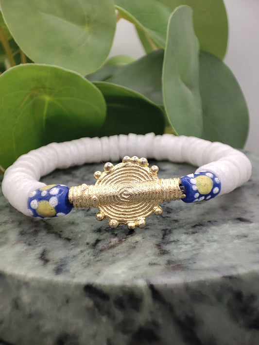 CAMÉLÉON FLORAL- Bracelet blanc et bleu en perles africaines Krobo-modèle myrtille.