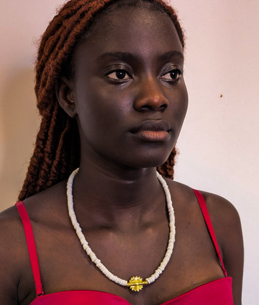 CAMÉLÉON. Collier jaune poivre et sel Perle akan couleur or