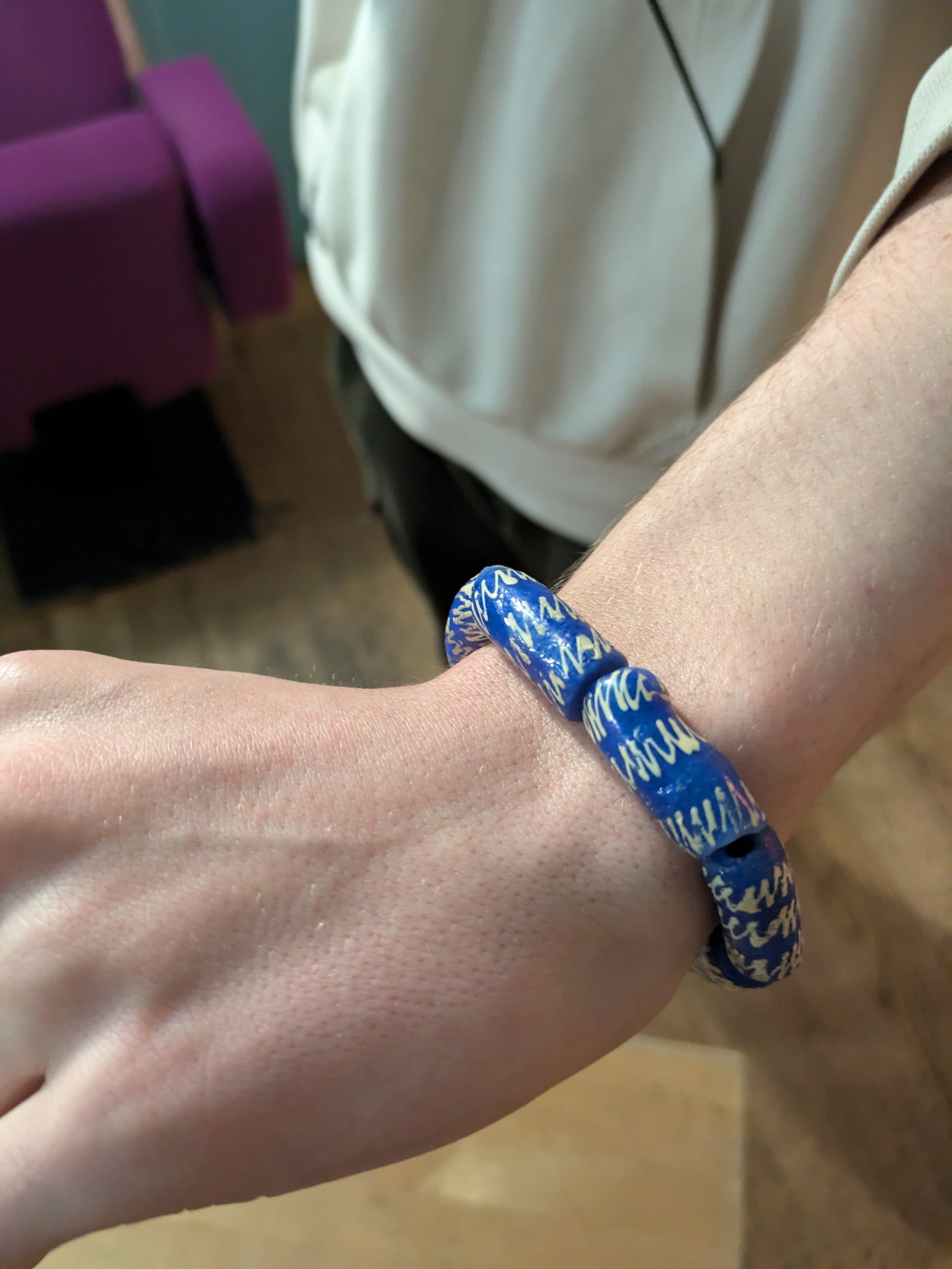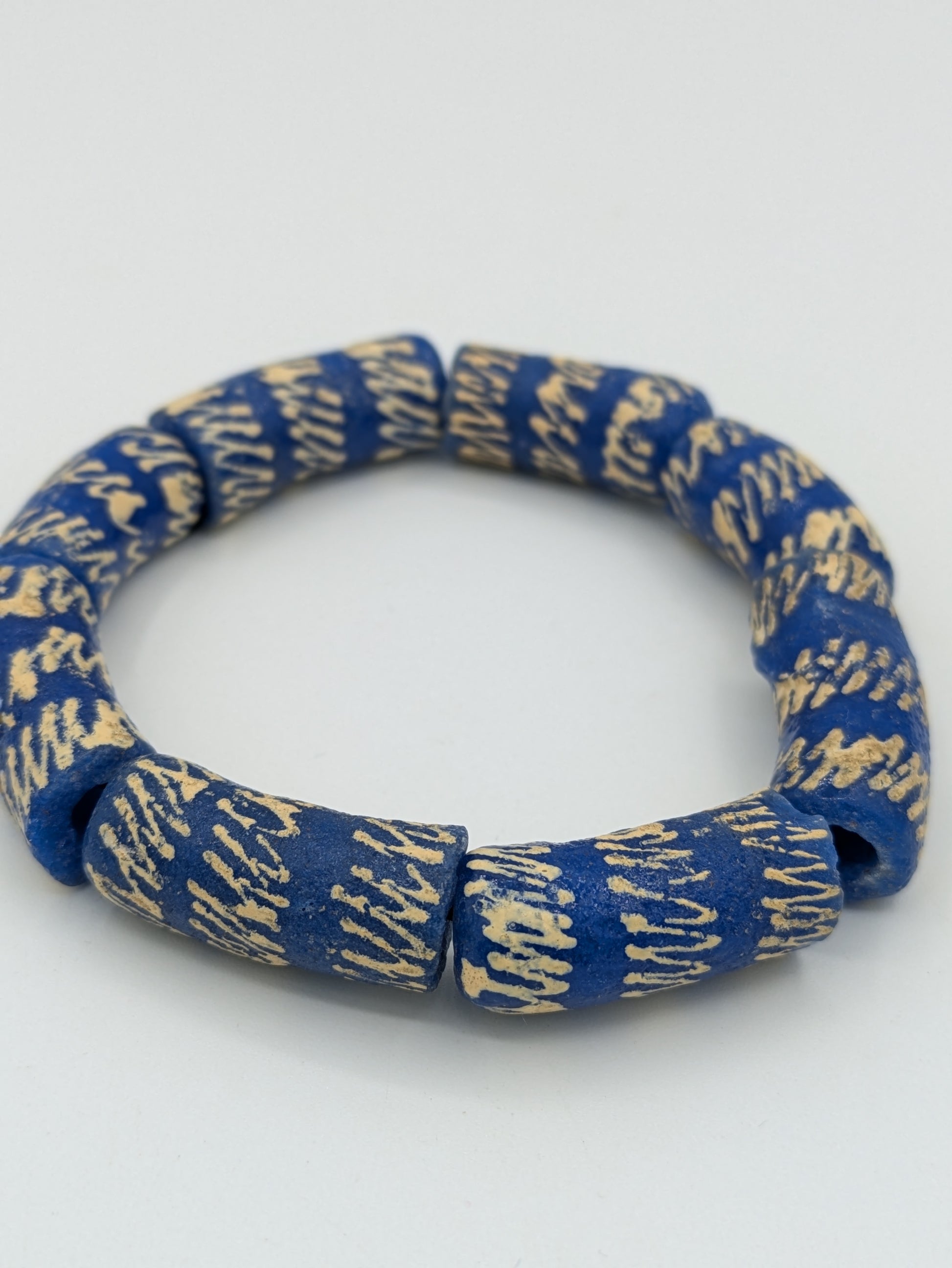 Esta pulsera azul, hecha a mano con cuentas de vidrio reutilizadas, está formada por cuentas gruesas (de unos 2 centímetros) con motivos en zigzag de color beige.