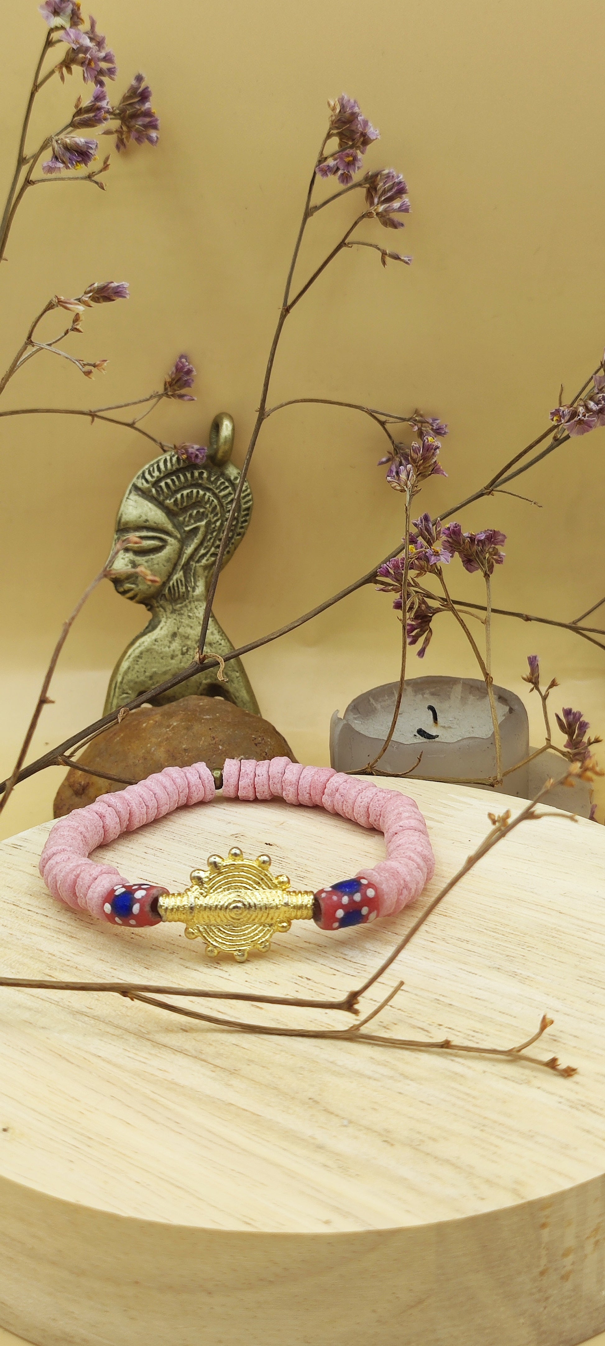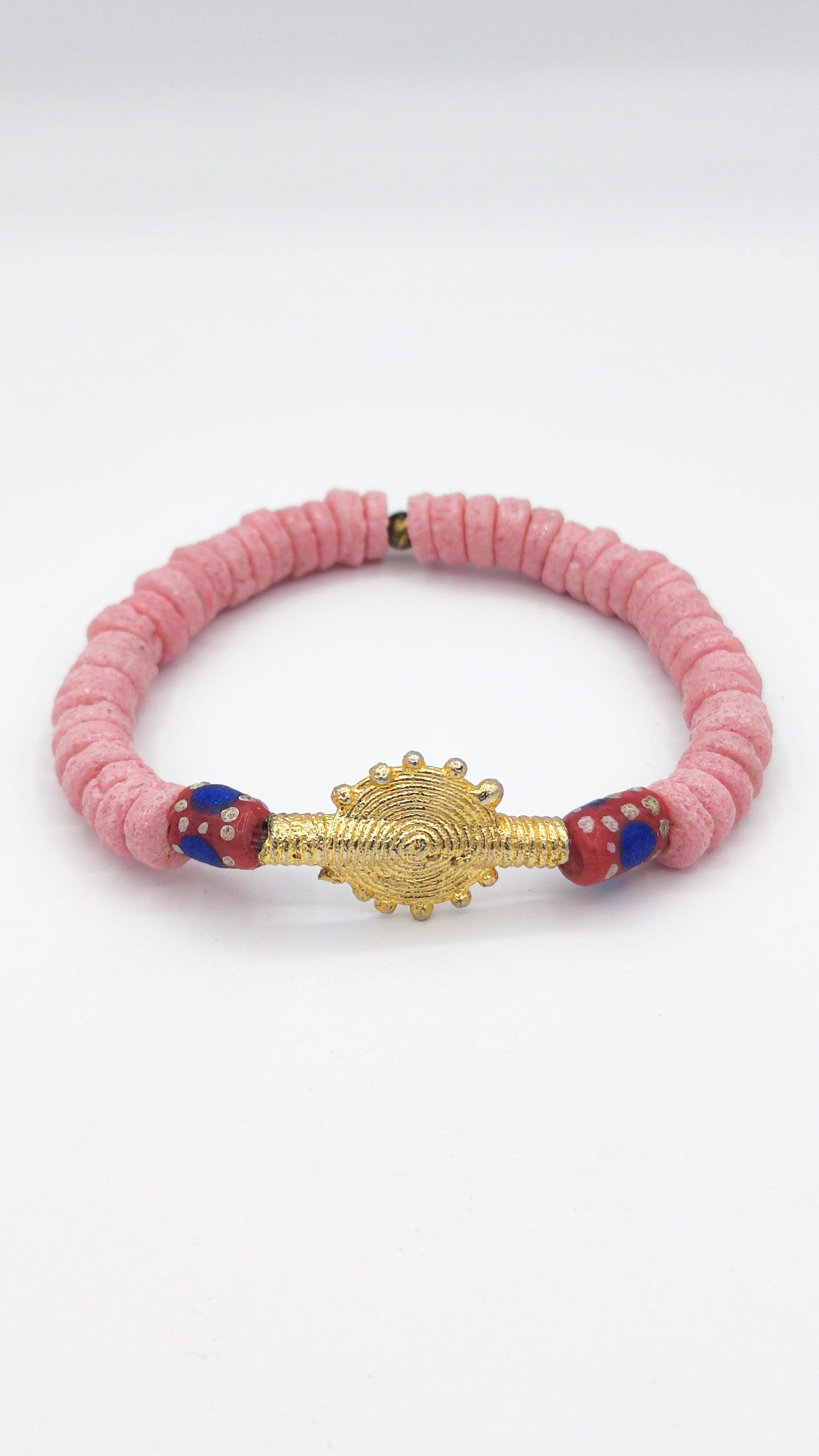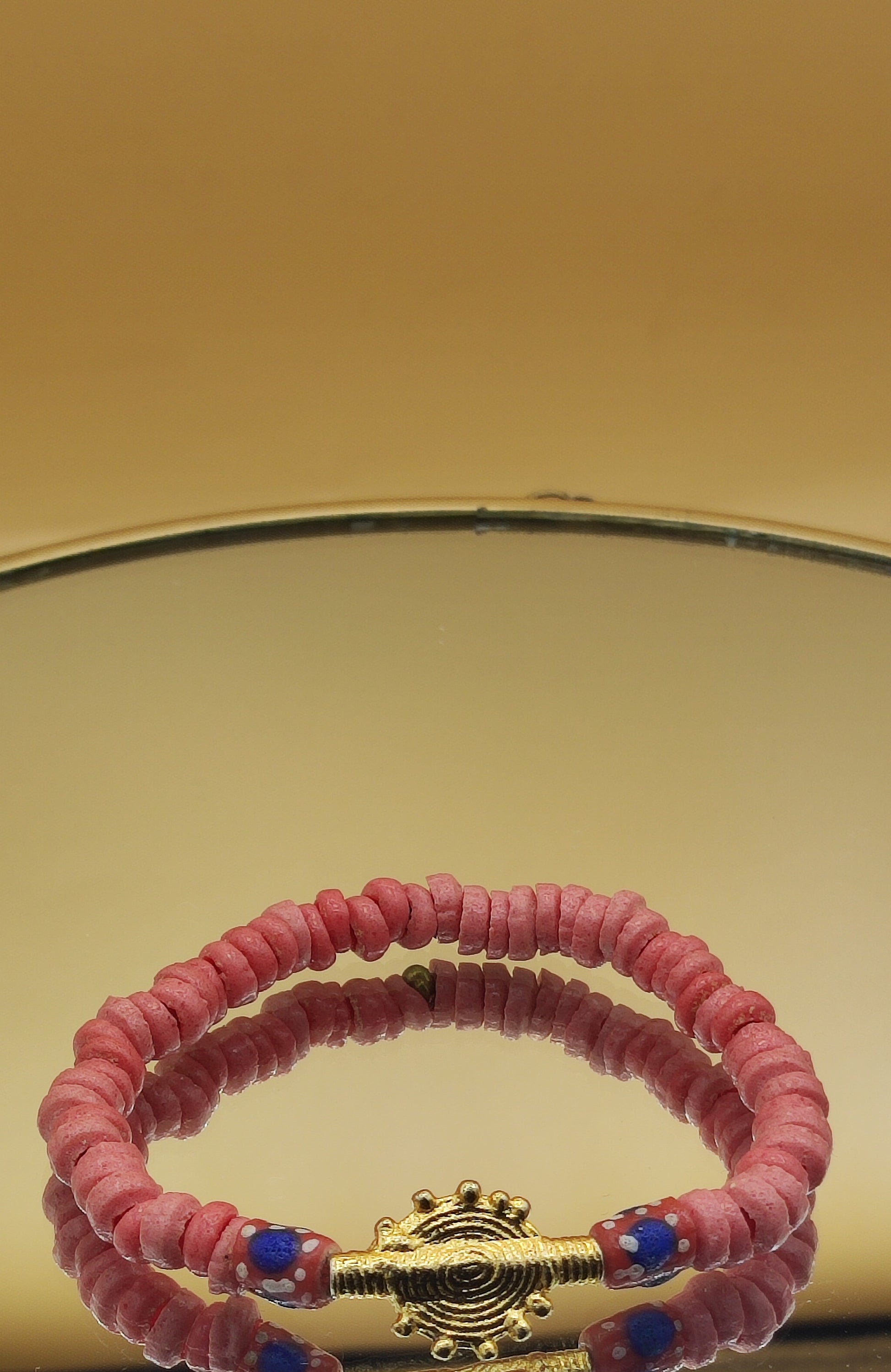 Avec le CAMÉLÉON, offrez-vous homme comme femme une touche d'originalité avec ce bijou africain et laissez-vous séduire par son poids Akan solaire, associé à ce beau rose poudré.